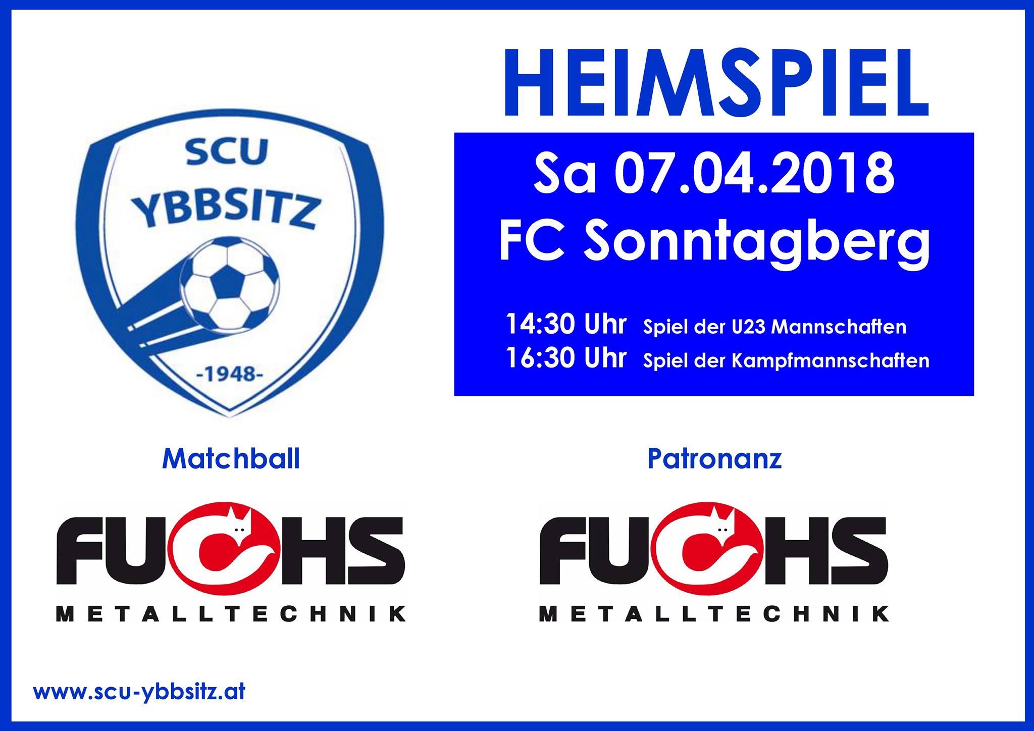Der SCU Ybbsitz gewinnt das 1. Heimspiel gegen Sonntagberg mit 4:2. Auch die U23 kann einen vollen Erfolg feiern und gewinnt ihr Spiel mit 1:0. Der SCU-Ybbsitz bedankt sich auch nochmals recht herzlich bei der Firma "Fuchs" für die Übernahme der Match-Patronanz. |